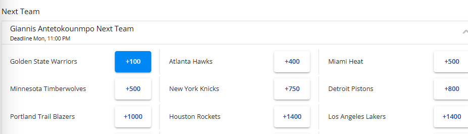 字母哥最新的赔率如下:1.勇士(+100)、2.老鹰(+400)、3.热火、森林狼(+500)、5.尼克斯(+750)、6.活塞(+800)、7.开拓者(+1000)、8.火箭、湖人(+1400)。